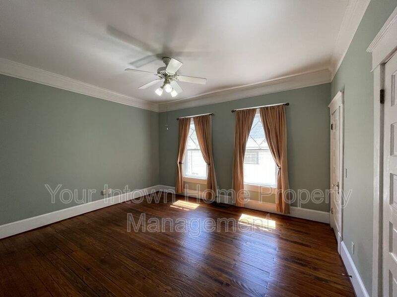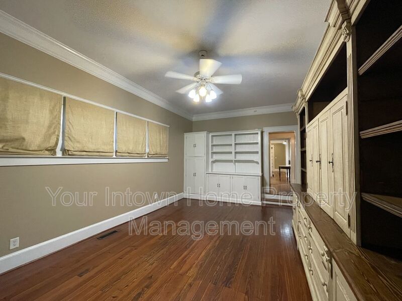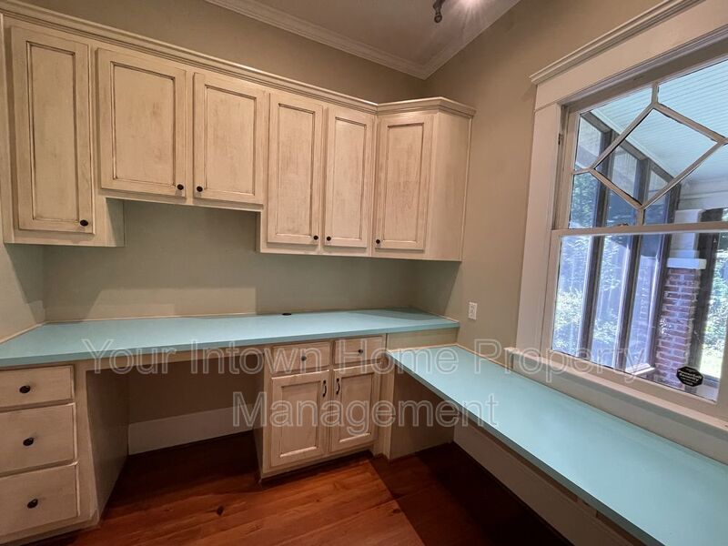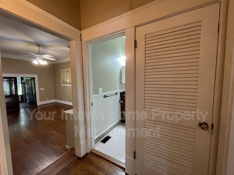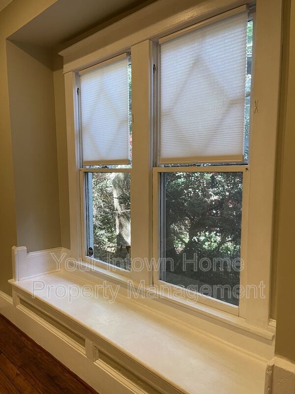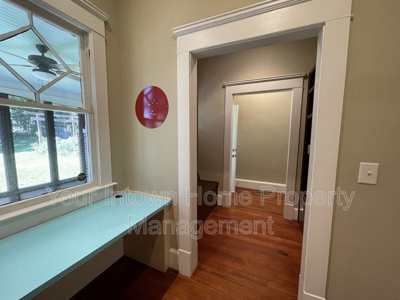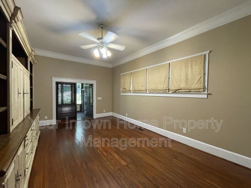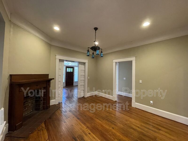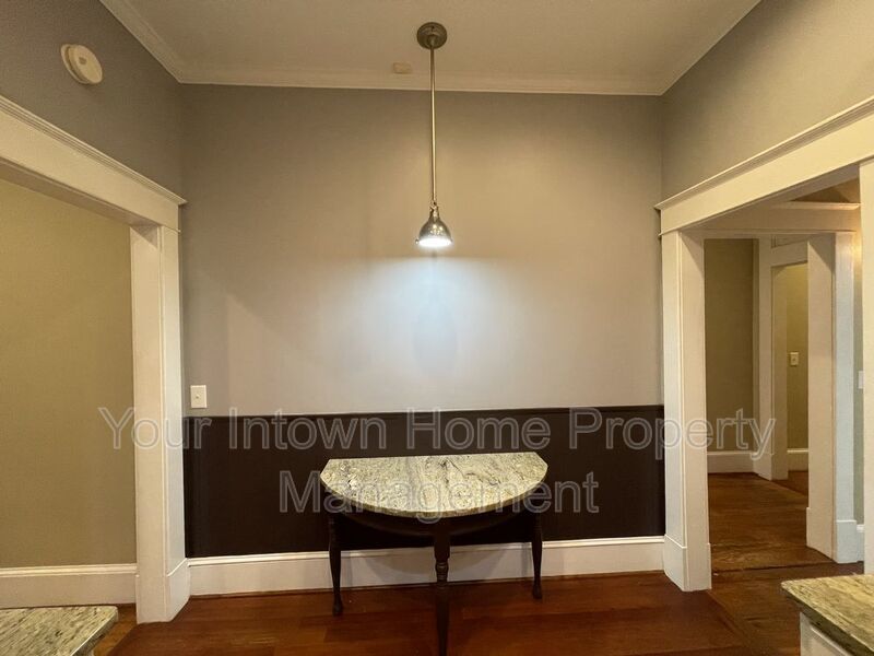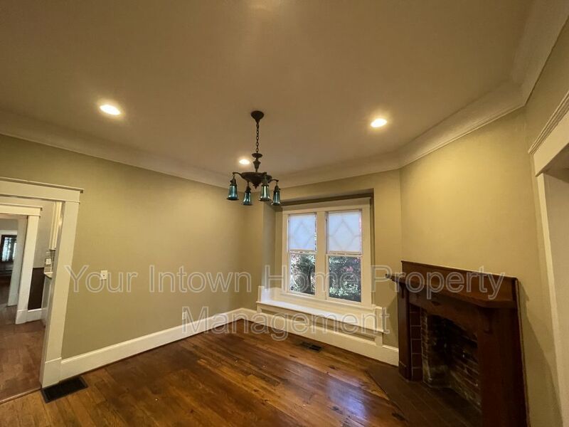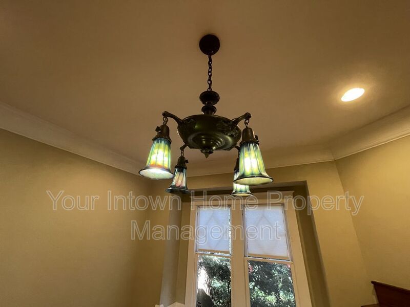 - Pocket doors, window seat, and vintage light fixture in dining room