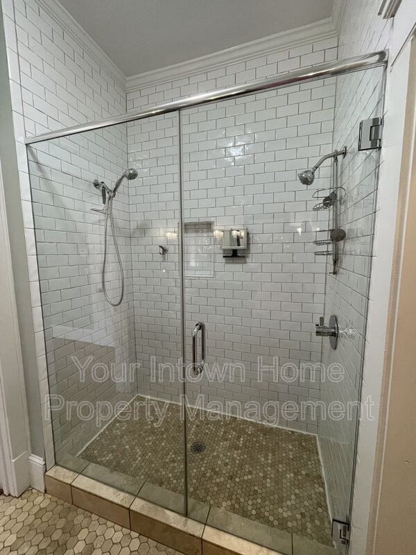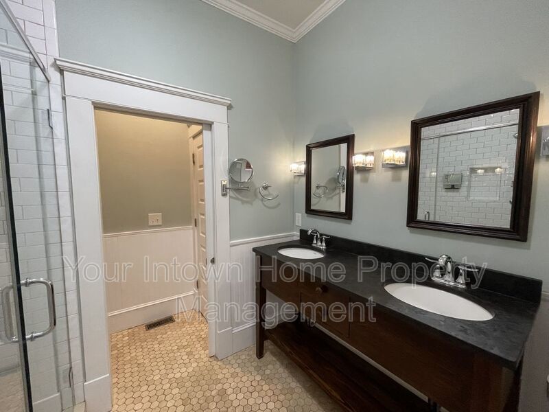 - Master bathroom has glass shower, separate commode, custom double vanity, and linen closet