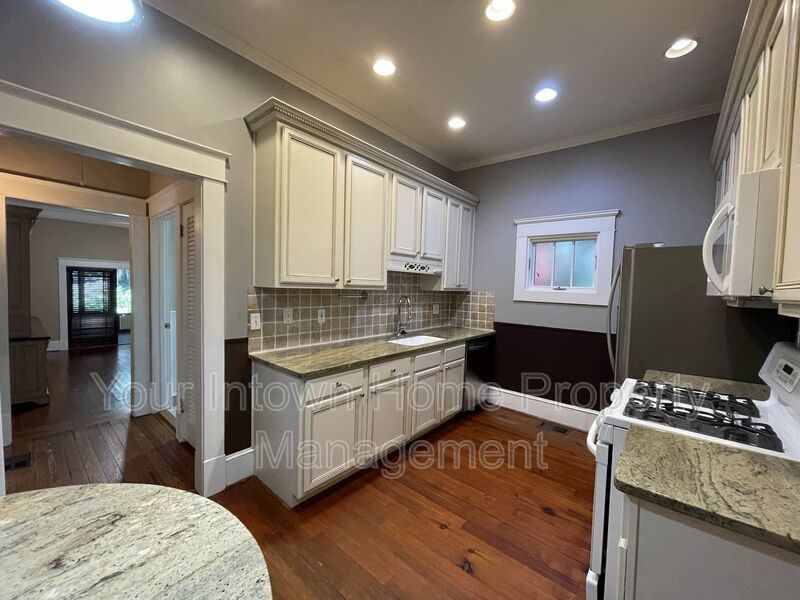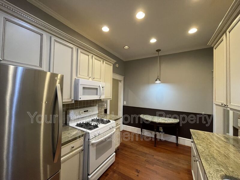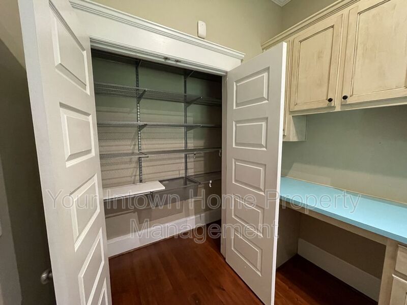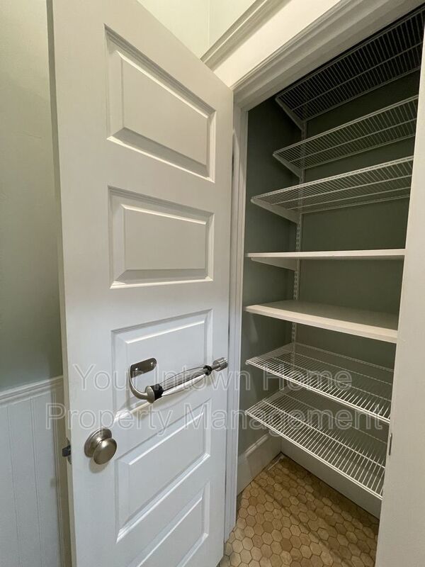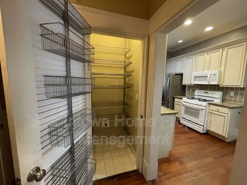 - Kitchen has granite countertops, white cabinetry, and pantry