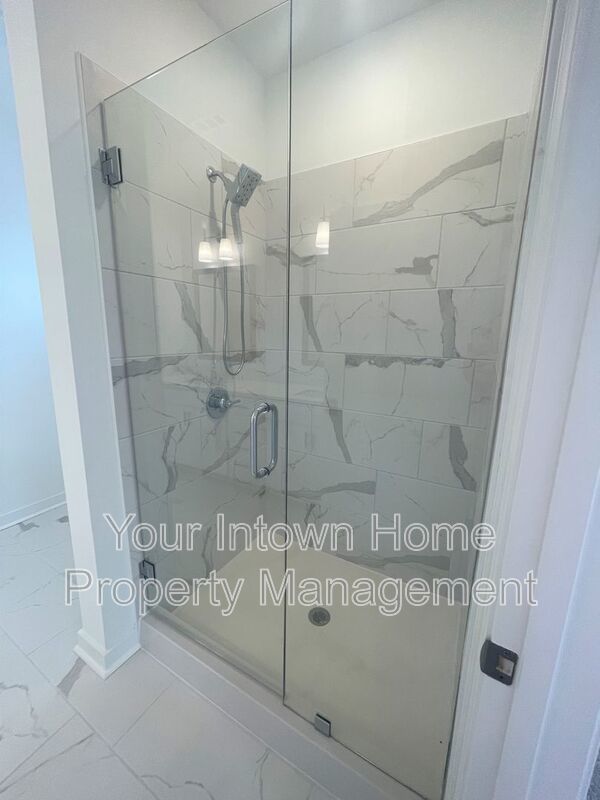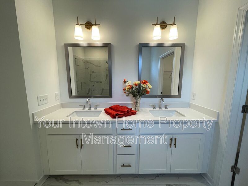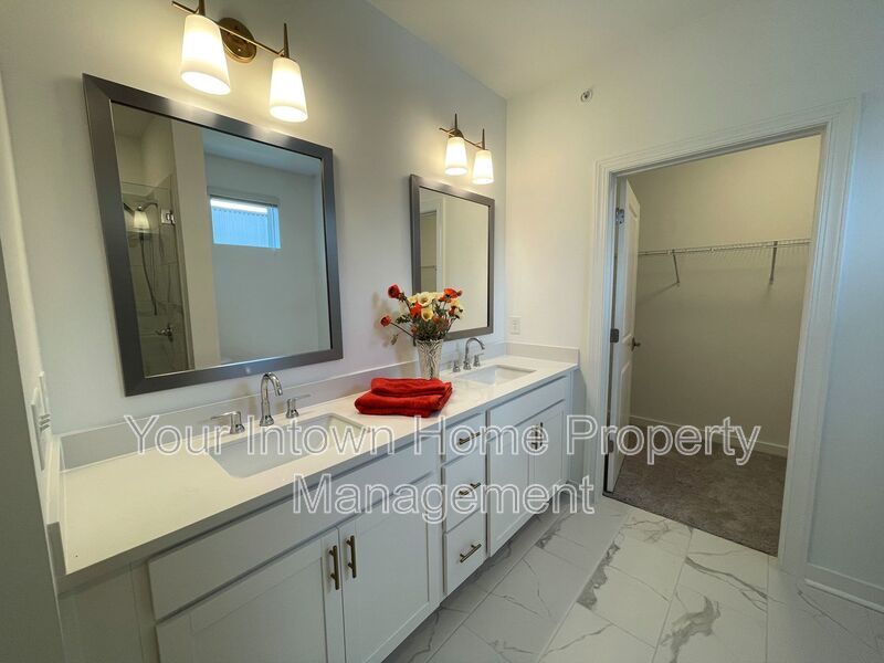- Primary bathroom has double vanity, glass-door shower and walk-in closet